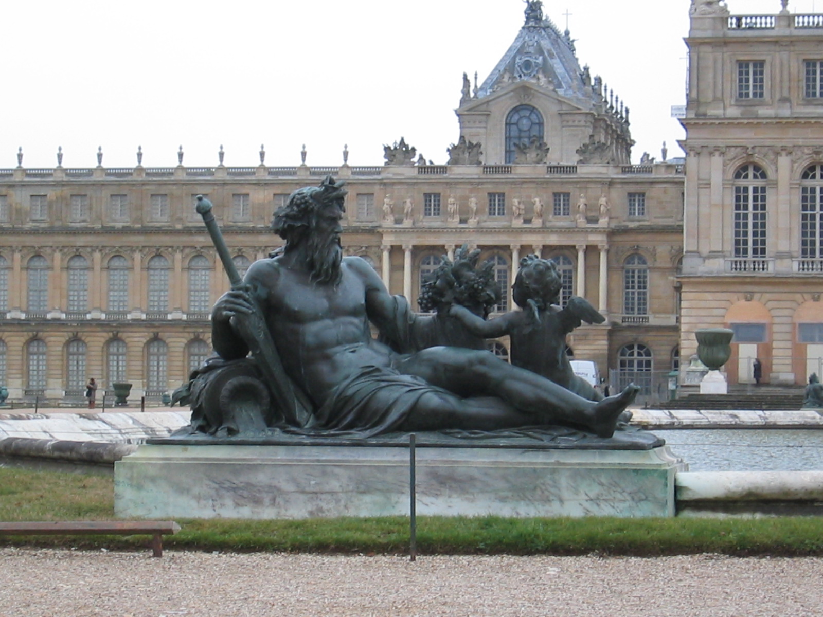 105_0511 105_0509 {Bronze sculpture of Neptune in the Versailles gardens and a bronze urn in the formal gardens}