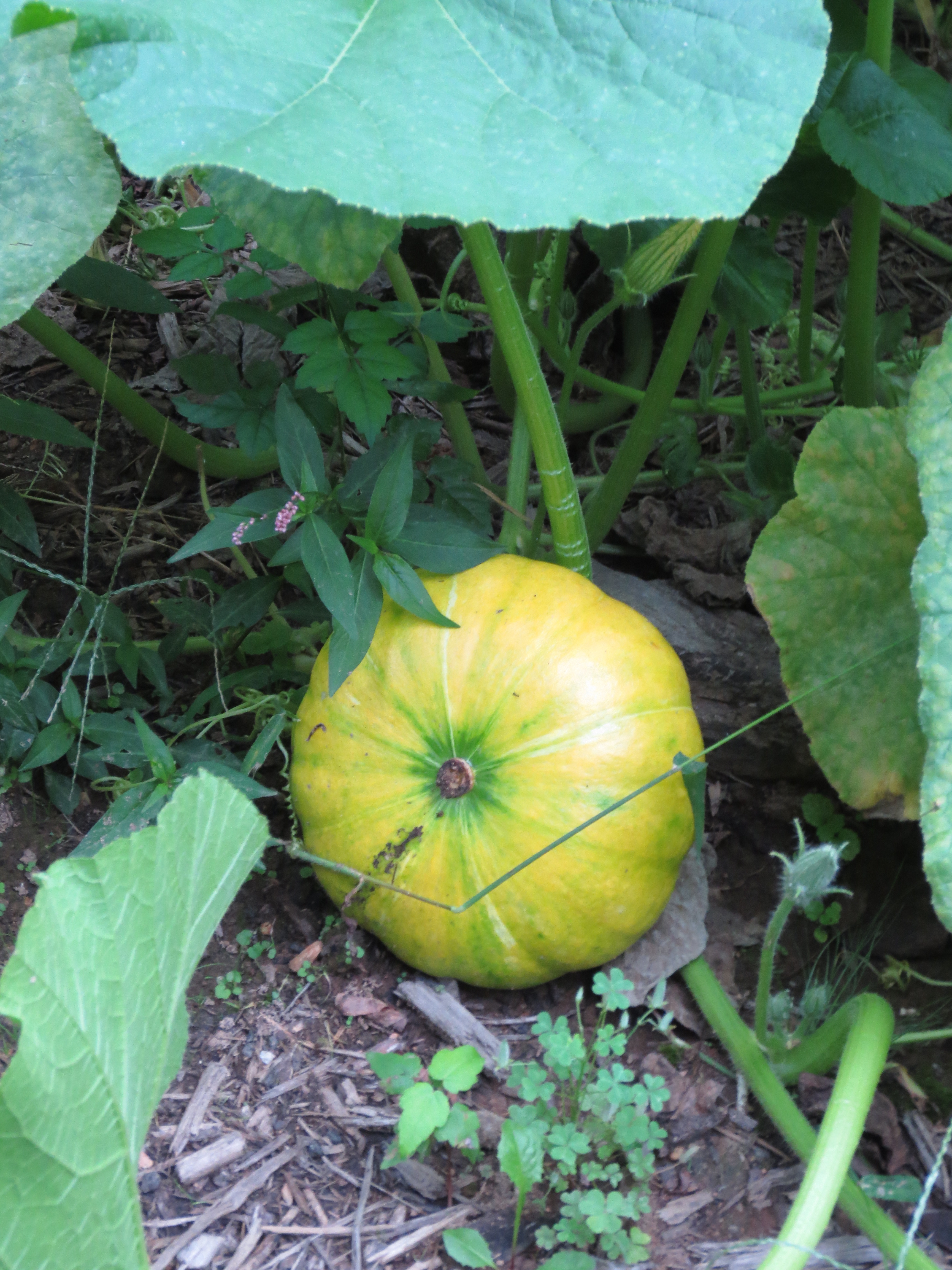 IMG_2039 IMG_3622As for the squash and pumpkins they are growing rather prolifically on the vines. The huge leaves are a foot in diameter and the gorgeous yellow flowers are still vibrant in color and quite tasty in salads or battered and fried for a snack. I am waiting for the rinds to thicken a bit and the color to deepen to orange so; they will be perfect as Halloween decorations.