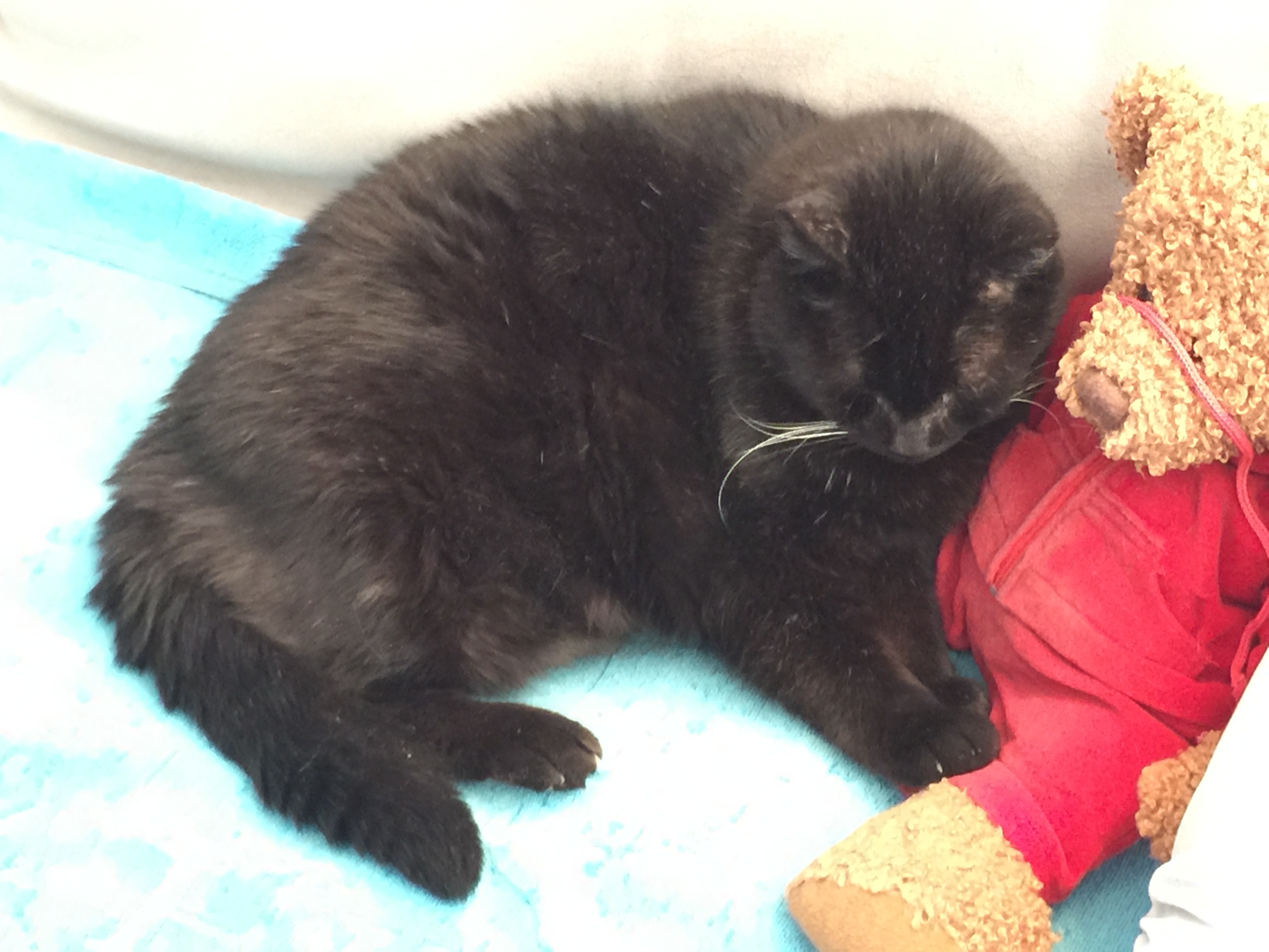 {Malcolm the Cat coping with cabin-fever by sitting with his stuffed bear and friend for life}