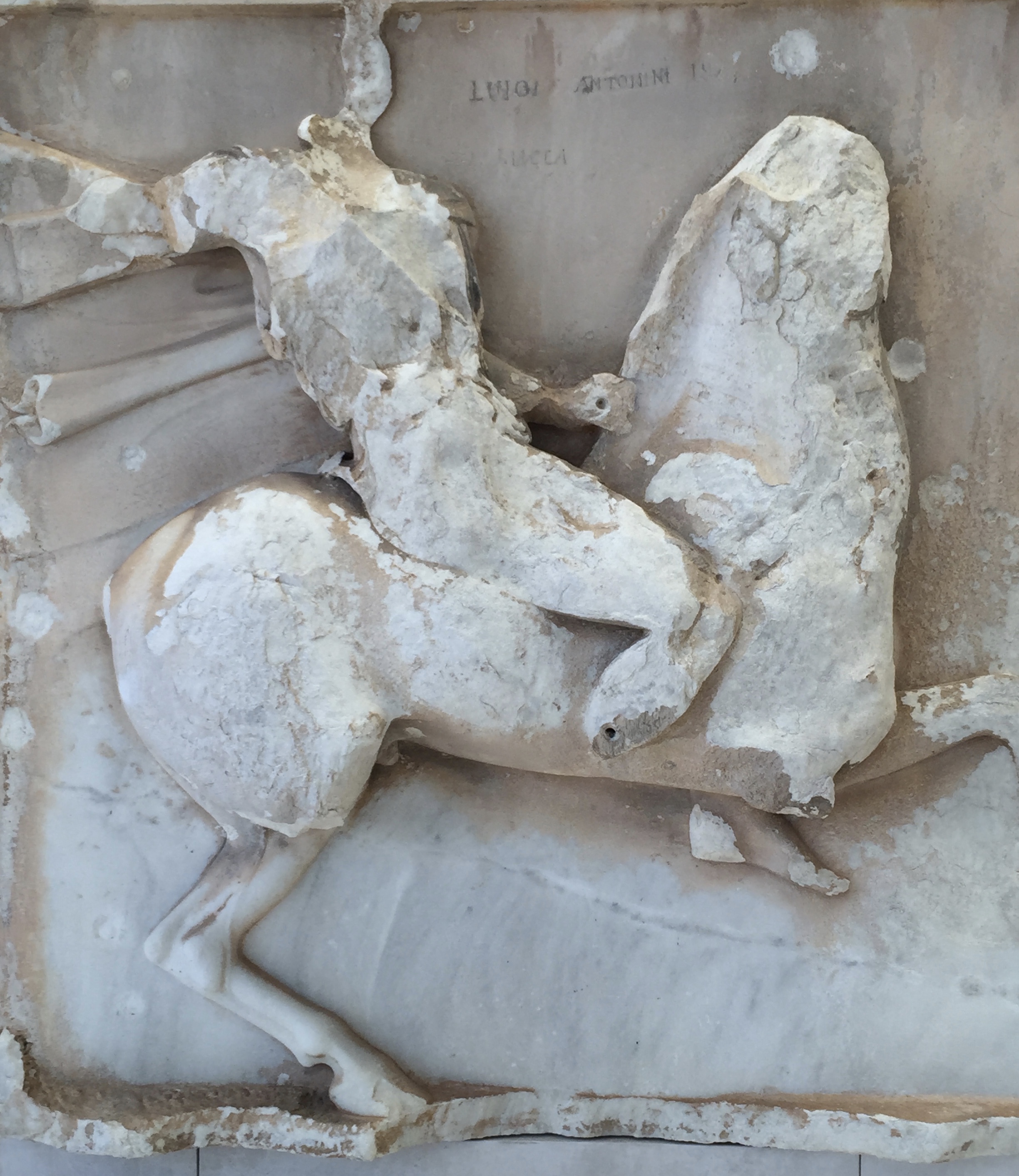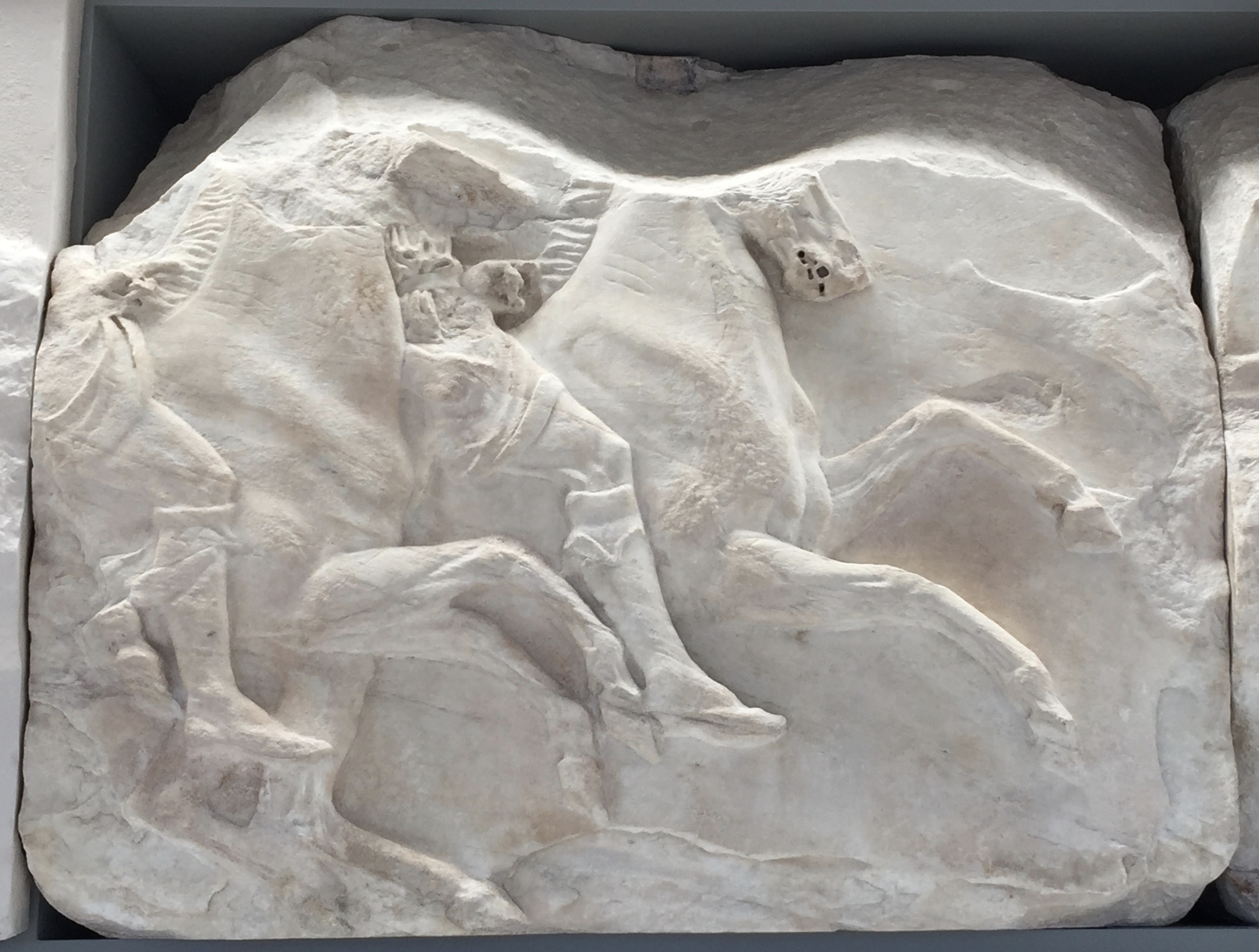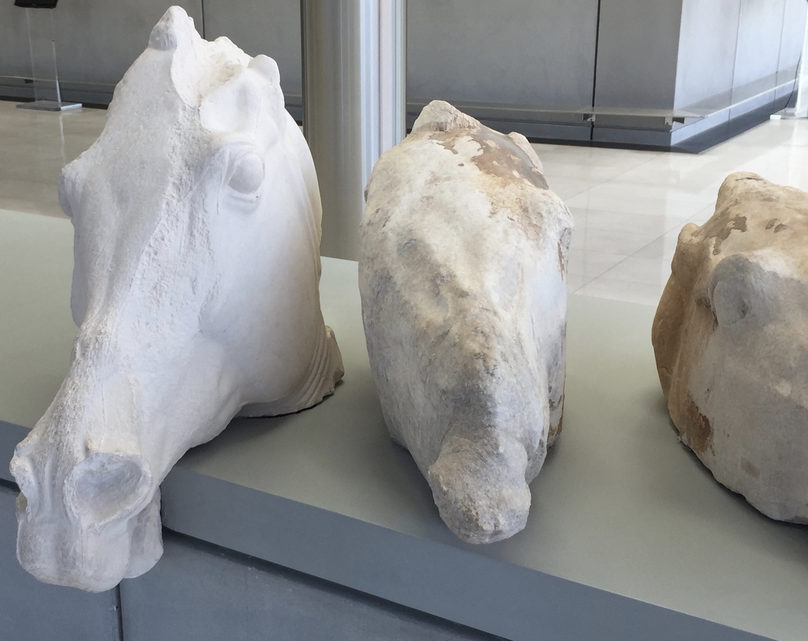 From the Parthenon this frieze is from a broad horizontal band of sculpted decorations on a wall near the ceiling, and the metope (carved in high relief) was placed at the same level as the frieze above columns on the outside of the temple. And lastly, marble sculptures of horse heads.
