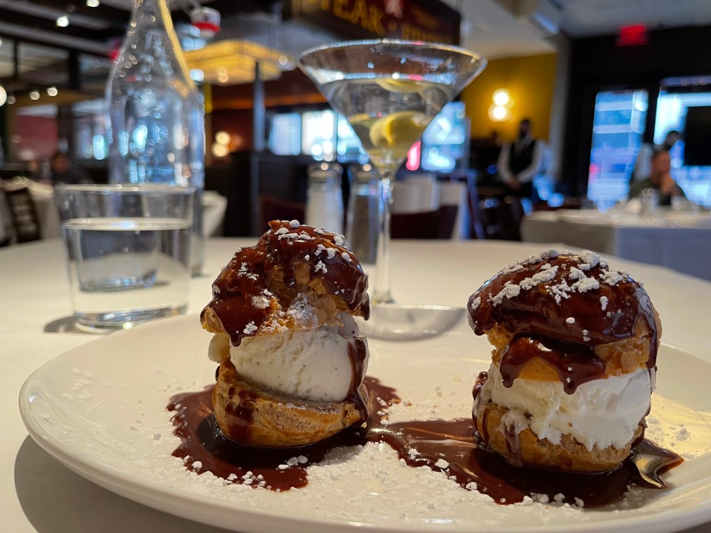 Profiteroles from Mon Ami Gabi in the Reston Town Center are cream puffs filled with a French choux pastry, but these were filled with ice cream and topped with chocolate sauce!!!