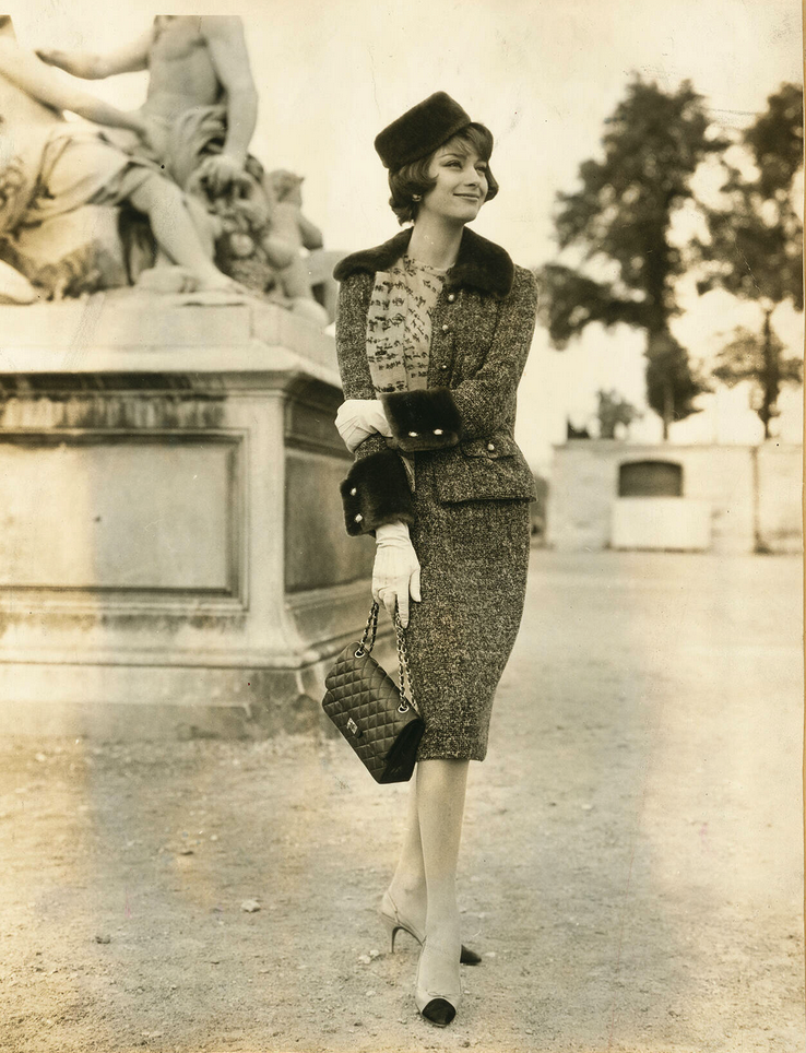 Marie-Helene Arnaud in tweed suit from Chanel’s Fall/Winter 1959 collection, wearing Chanel shoes and the 2.55 Chanel handbag.