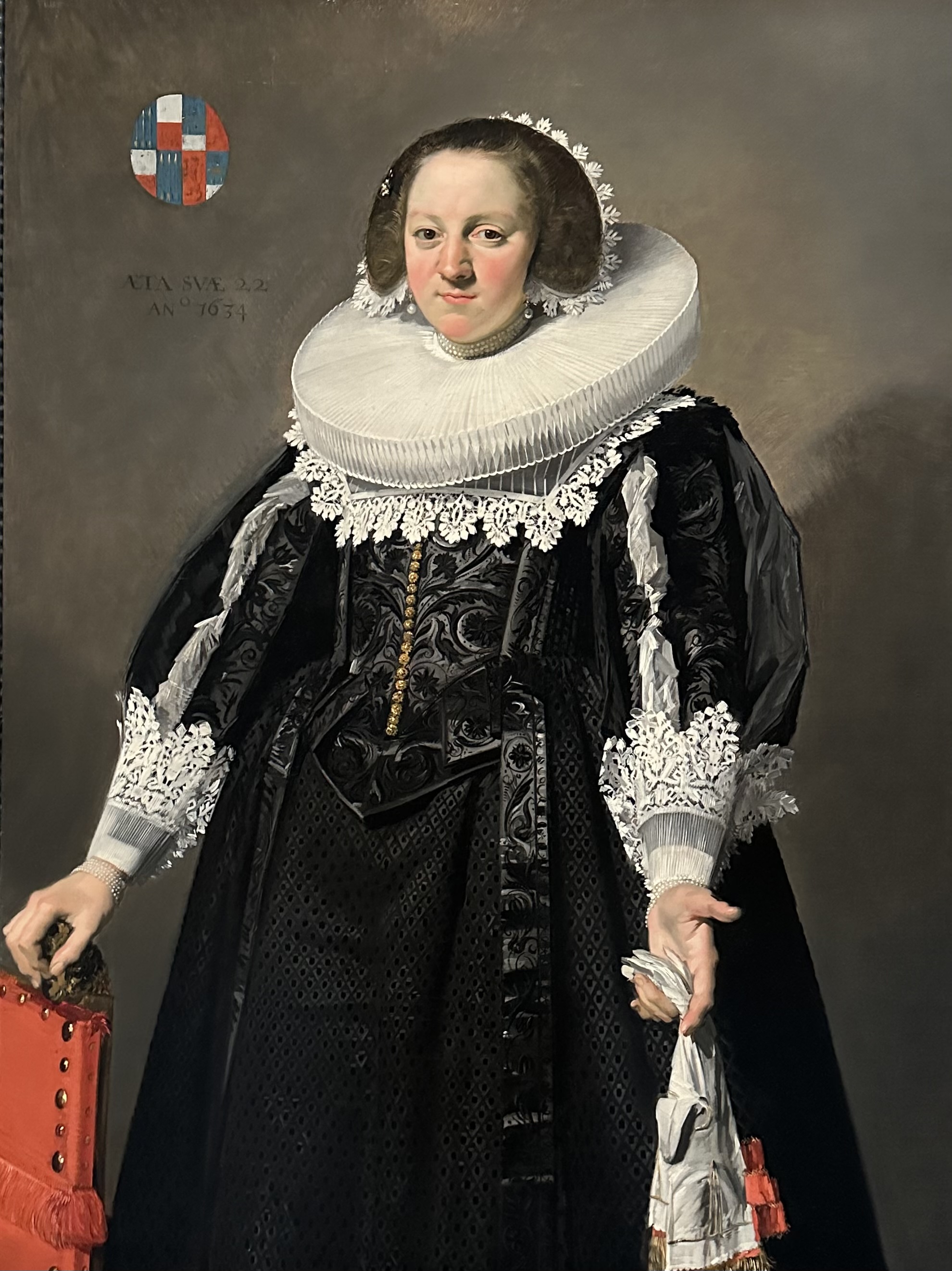 This young lady is Catharina Brugman who is twenty years old and comes from a prosperous textile family. She is engaged to Tieleman Roosterman who also is from a textile family. The glove in her hand symbolizes an engagement or marriage, and the lace on her sleeves and around her neck indicate wealth.