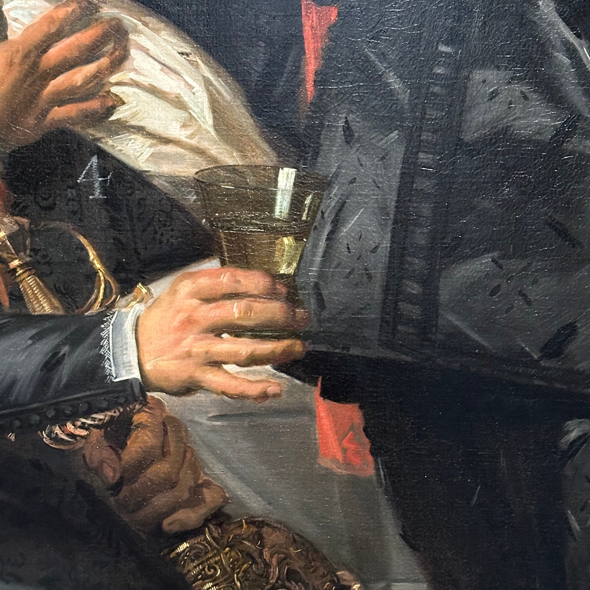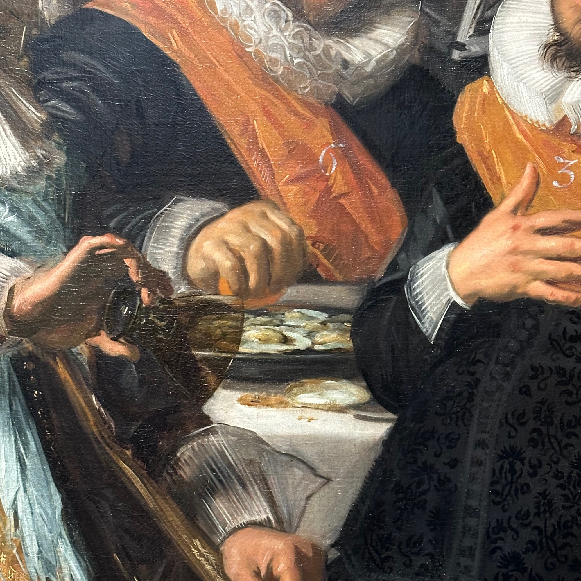 Civic guard banquets were known to have copious amounts of food and drink, and the gentleman with the upturned glass looks out of the canvas, signaling that he is ready for a refill.