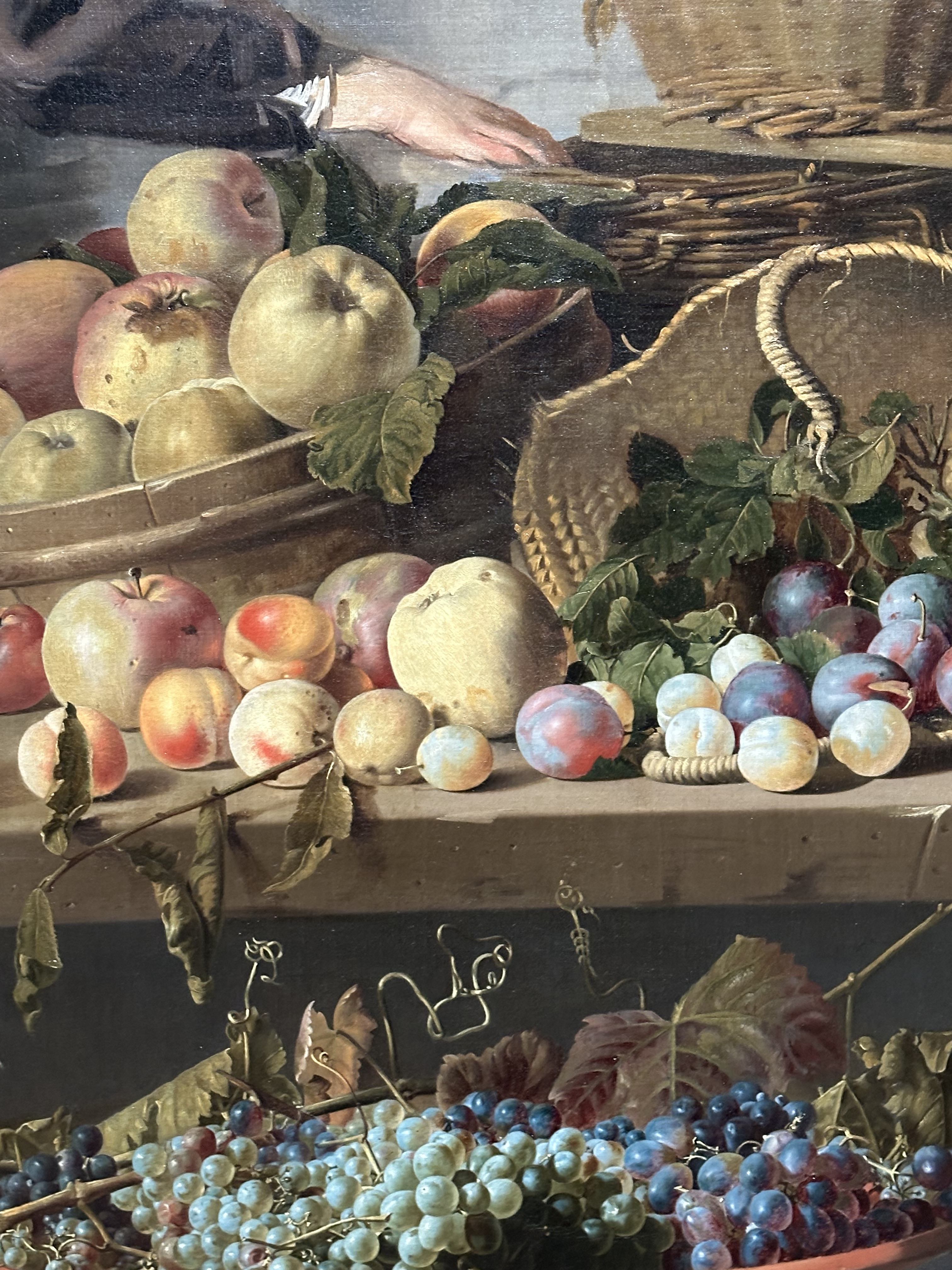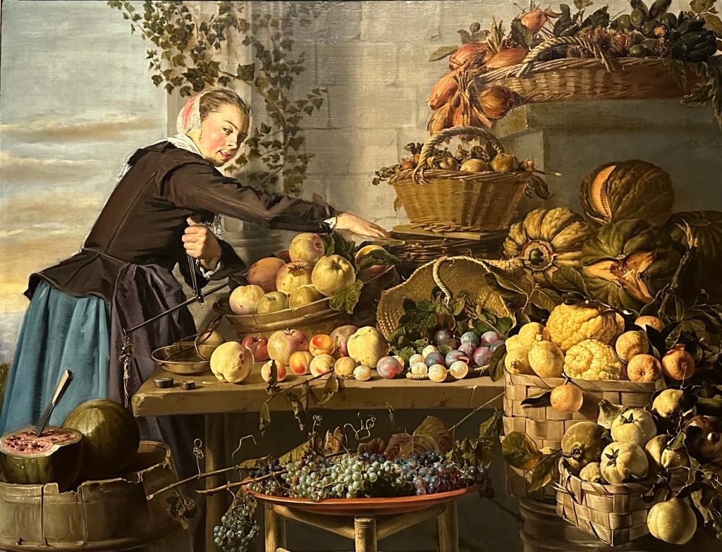 The majority of 17th century workers in the marketplace were women, and this young market seller is casting a side glance at the viewer, along with weighing some fruit. Hals suggested her movement in swift brushstrokes; notice her outstretched hand. Look at the soft haze on the grapes and plums, and the fuzz on the skin of the quinces.