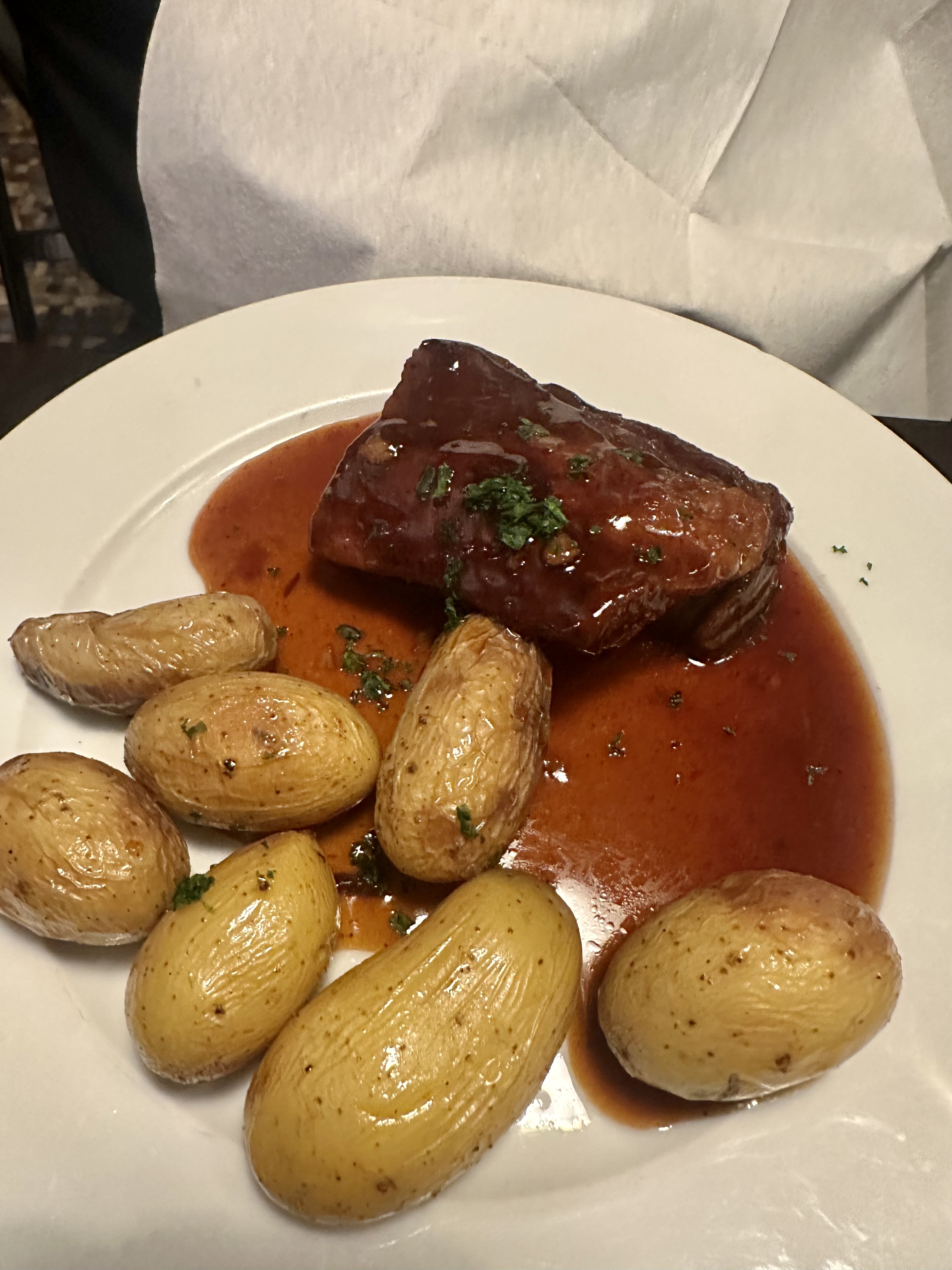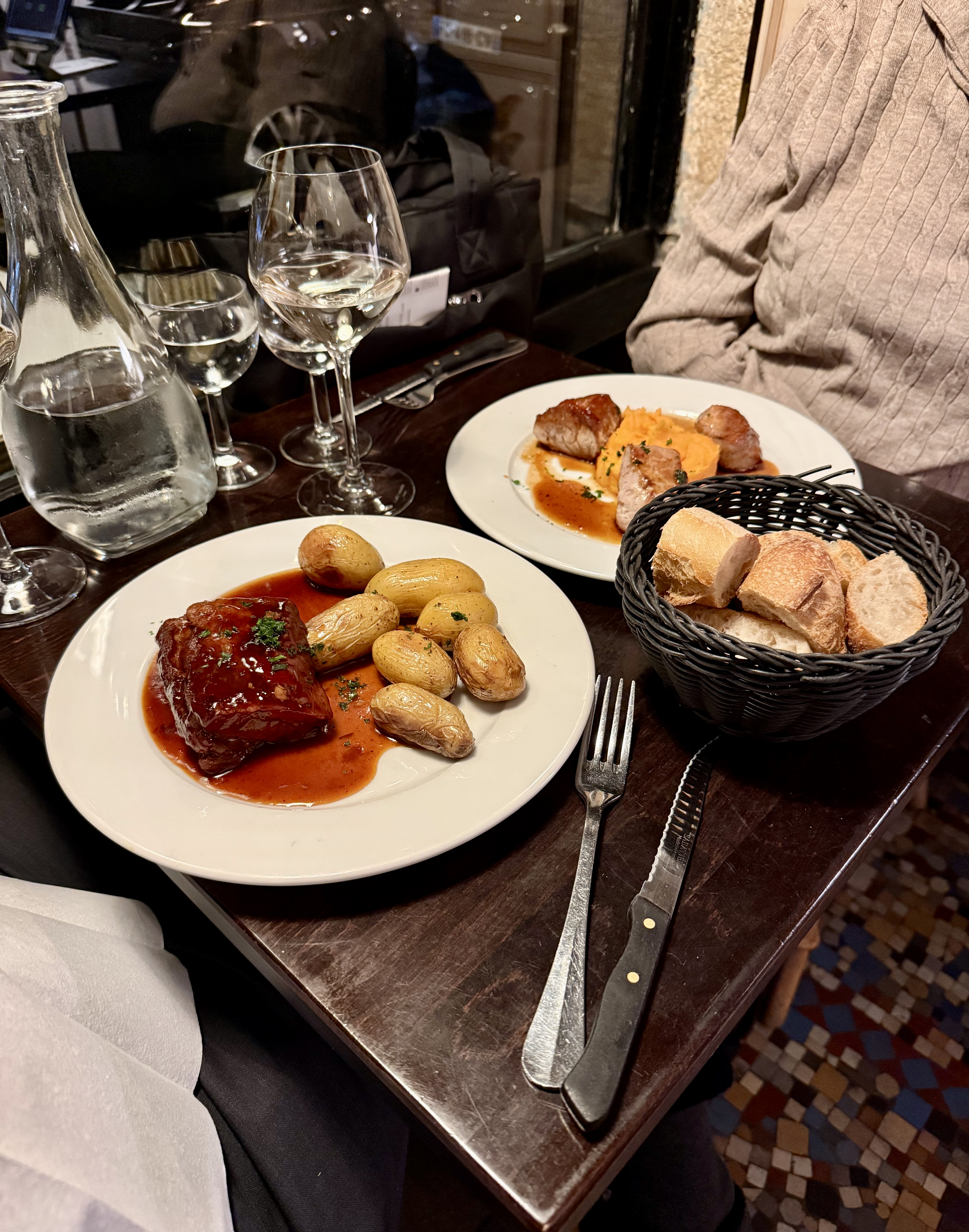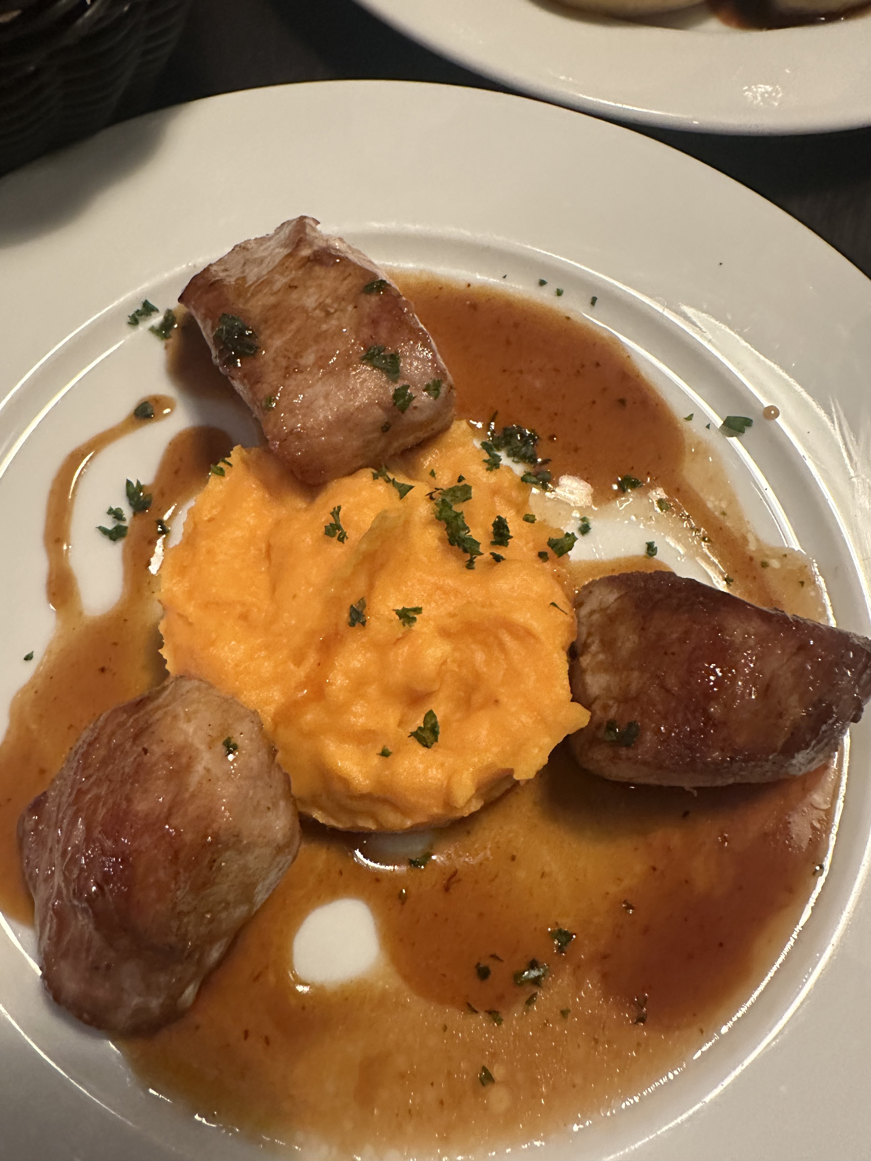 I ordered the specials of the day, the butternut squash soup and the Travers de Porc [Honey-Glazed Oven Ribs]. Our waiter shared part of the recipe so, I can’t wait to rework the flavors.