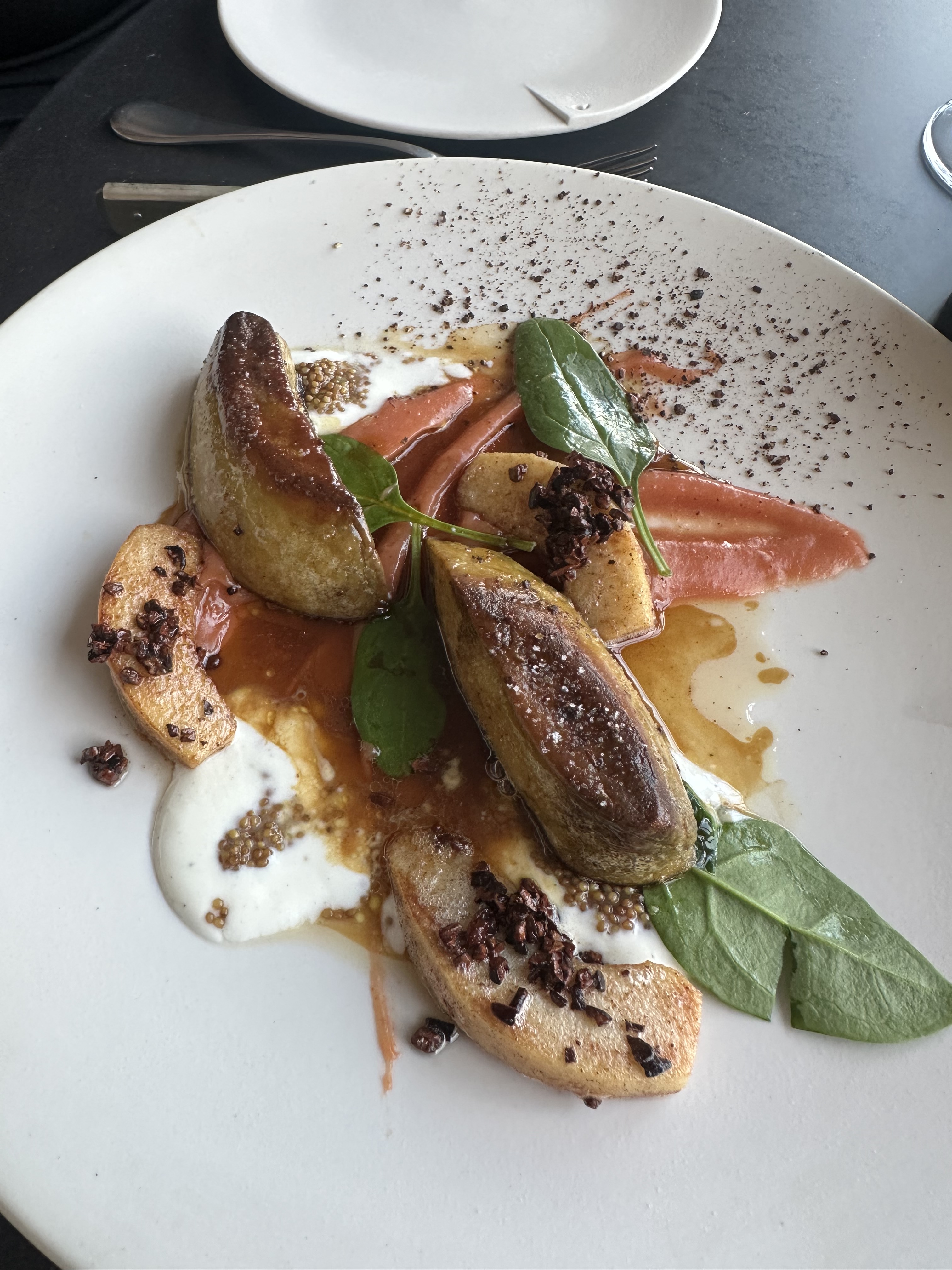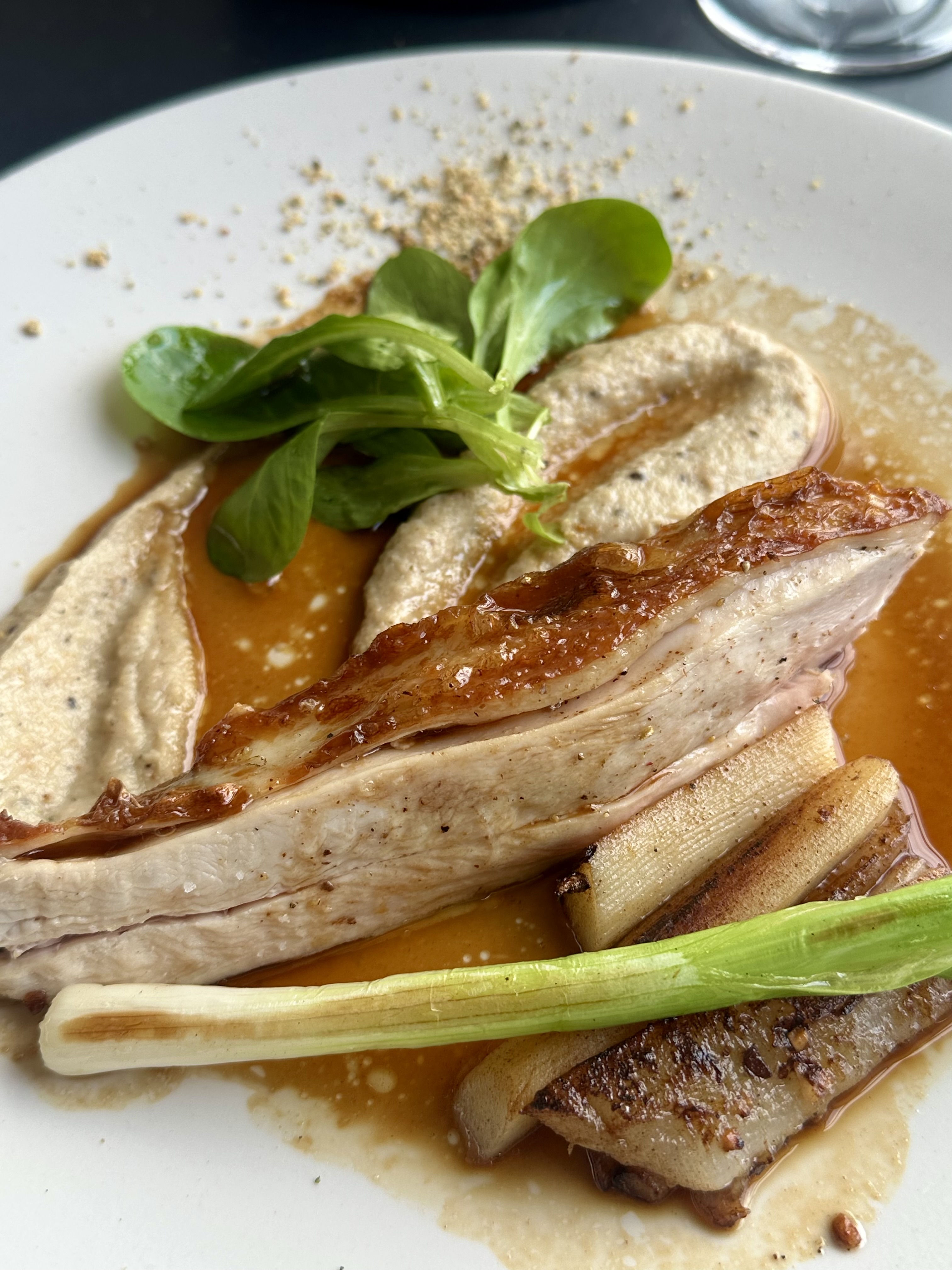 On the top floor of the Bourse de Commerce- Pinault Collection overlooking the rooftops of Paris is the restaurant of Michel and Sébastien Bras …… the Halle aux Grains. A converted grain exchange that provides inspiration for a healthy and contemporary menu. There are three distinct services each day; lunch, afternoon, and dinner based or defined by the changing light of the day. We had lunch at 1:30pm, and chose the grilled endives with refreshing green apples and hazelnut crackers. Next, we shared the pan-fried Poitou duck foie gras with wild quince dressing and the fromage blanc, along with the roasted chicken.