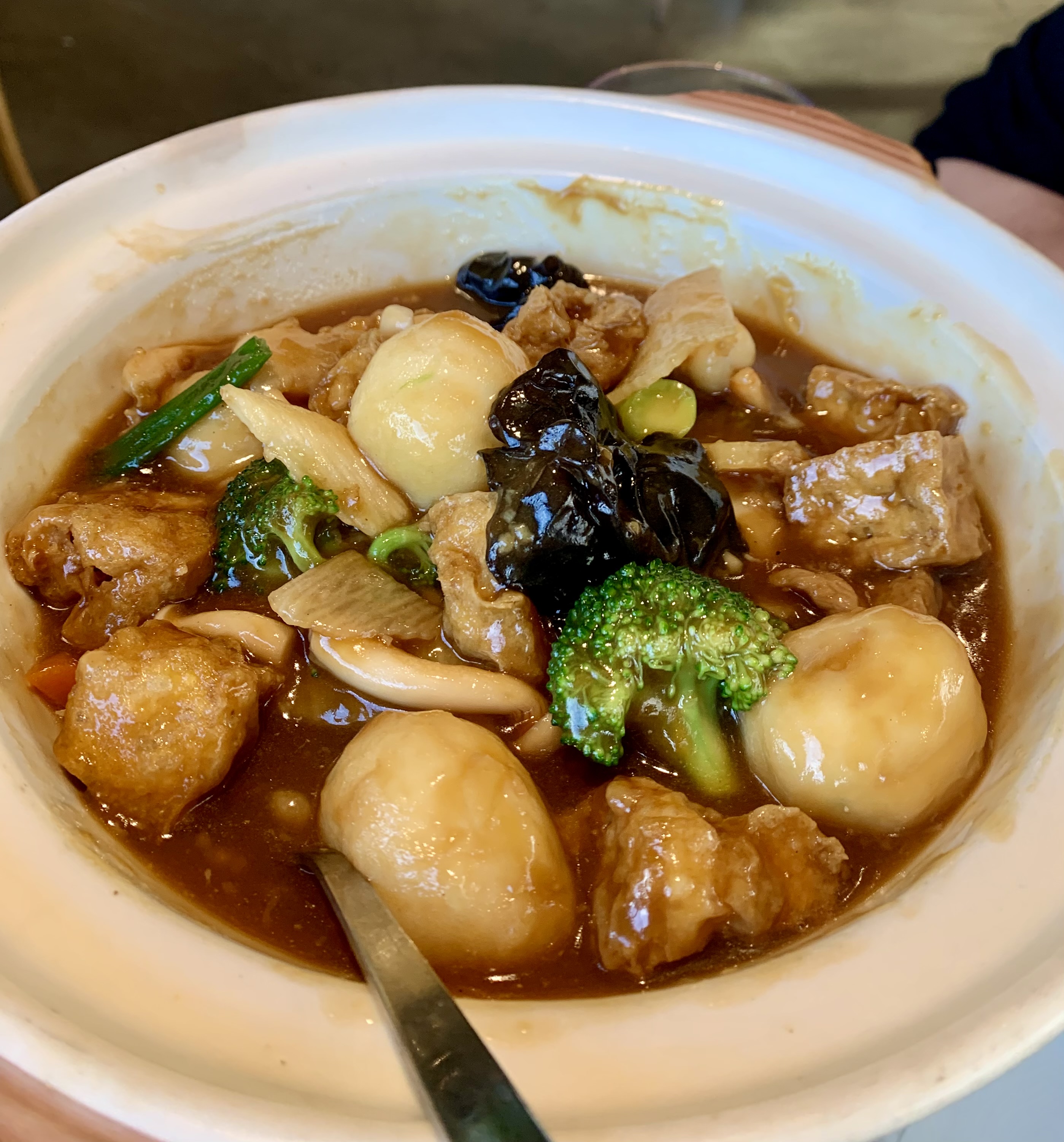Seated in a wood lined booth near the windows created a bit of privacy, while we shared several dishes starting with steamed shrimp dumplings and crispy duck spring rolls. Next, was the beef chow fun with wide flat rice noodles and thinly sliced sirloin, lots of onions and garlic. Our main meal was the seafood & tofu in a clay pot [hot pot] that had fish, scallops, shrimp and wood-ear mushrooms to be served over a bowl of white rice. All the dishes were phenomenal in flavor and taste.