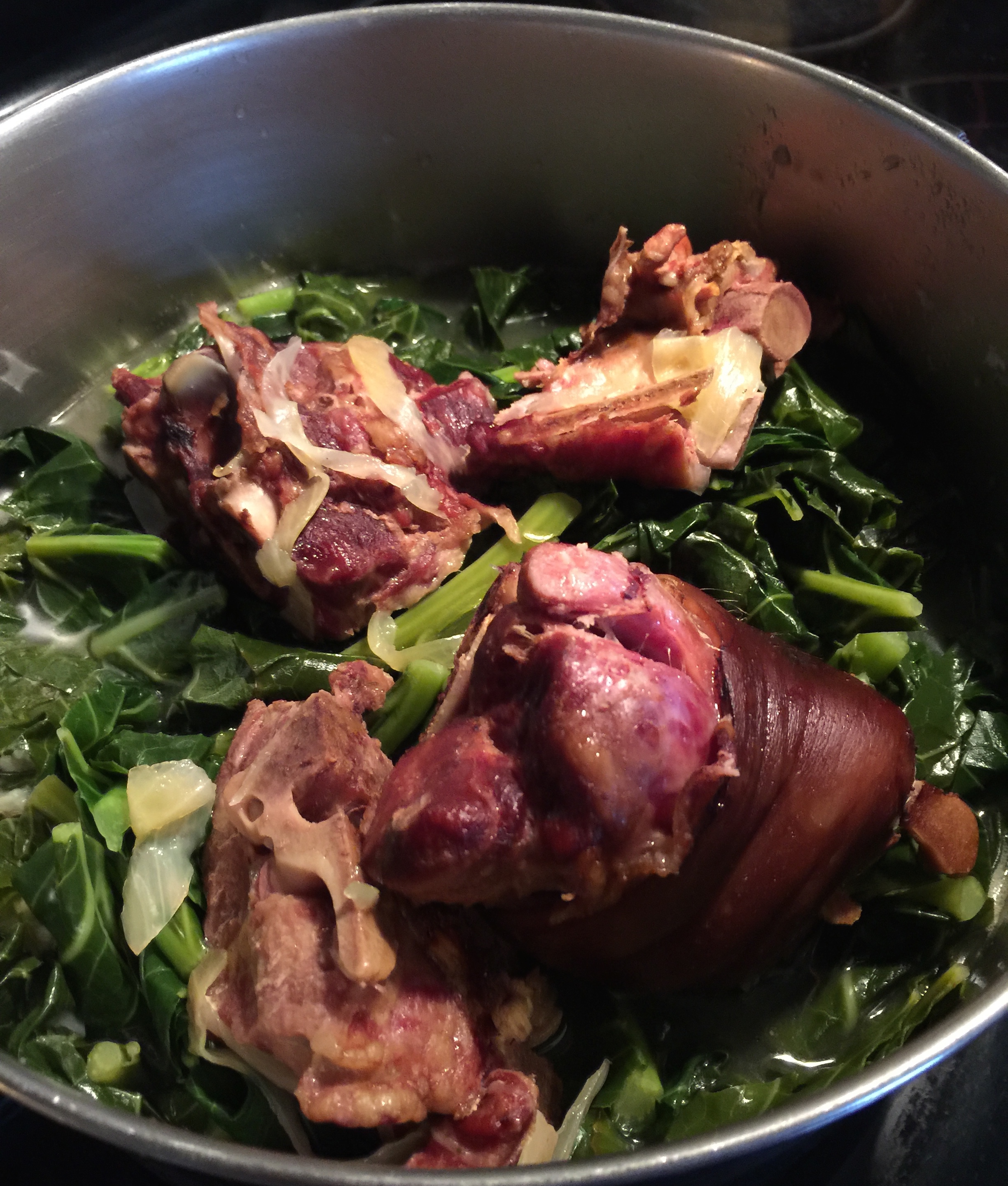 {Asian cucumbers piled high at the market and fresh collard greens only 89 cents a pound on the stove made with ham-hock and neck bones were cooked for dinner}
