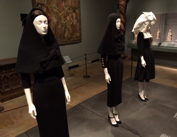 The mannequin on the right has on the black and white synthetic crepe and white cotton canvas by the House of Moschino, like in the television show The Flying Nun 1967. The mannequin in the middle is wearing Dolce & Gabbana’s “Angelica” ensemble from spring/summer 2016.
