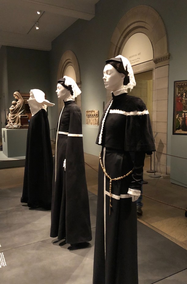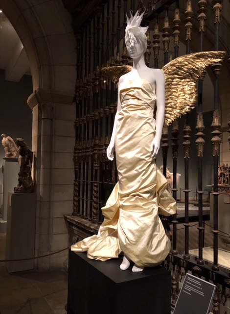 This is the second installment on the Heavenly Bodies exhibit at the Met on Fifth. Based on several articles read the majority of the designers included in the exhibition grew up Catholic, each having ties to the church. The articles of clothing were not only exquisite in design, but the chosen fabric or materials were most elegant; silk taffeta, mink, crepe and gold.