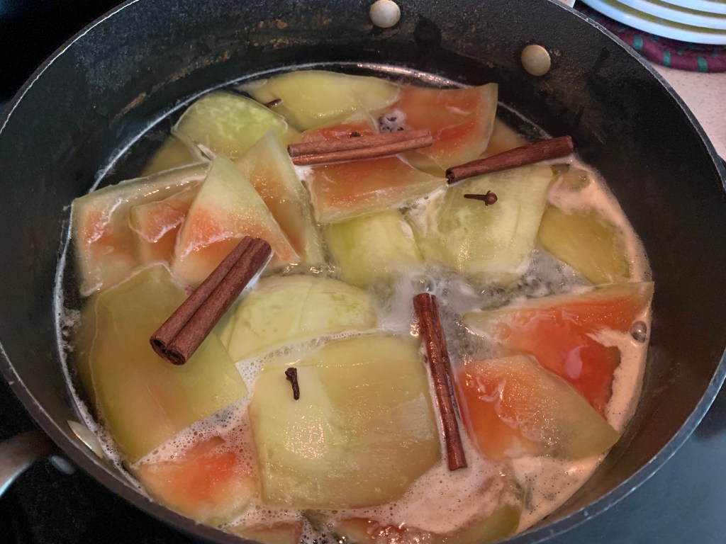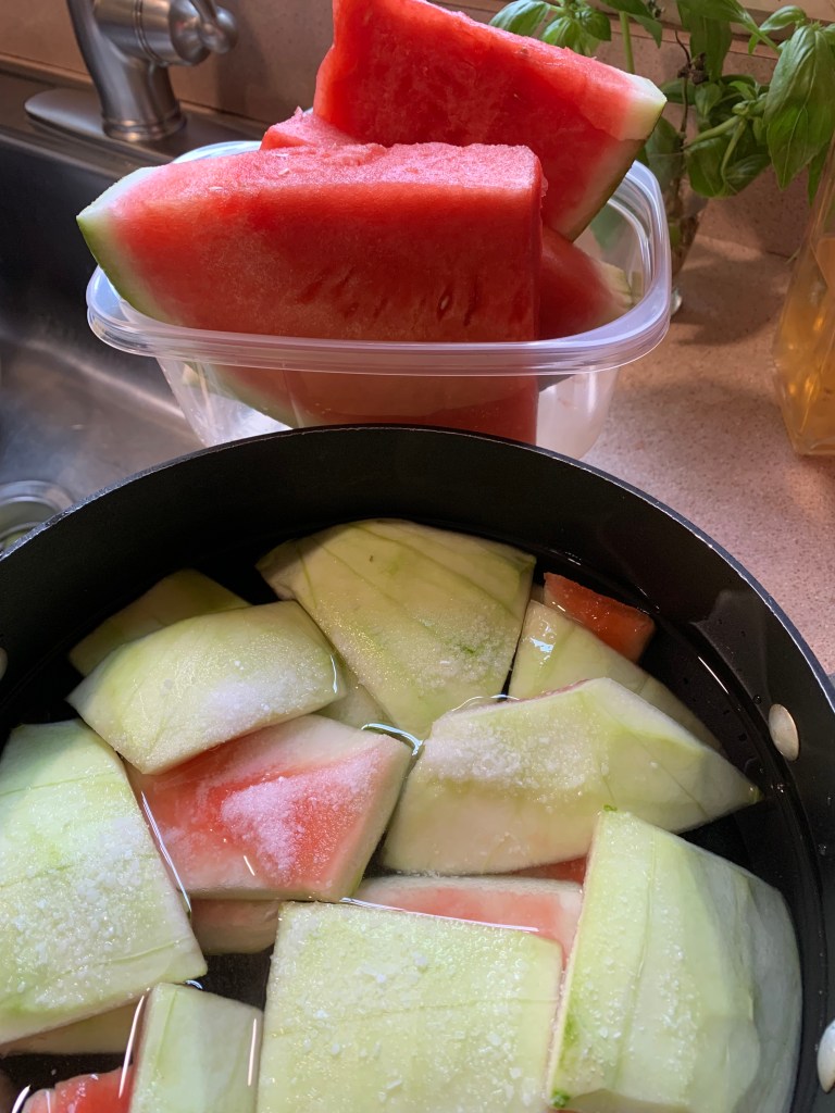 As I carved the watermelon, I remembered a recipe my mom made from summers past pickling or preserving the rinds. Pickles are always top on my list, but a preserve was more in order for breakfast with the ham and biscuits or a lunch of Effie’s wheat crackers, Camembert and a slice of cold ham.