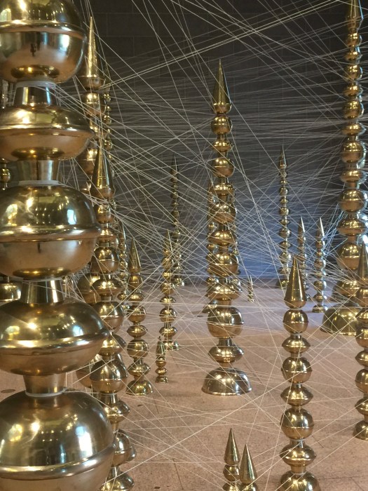 From the Freer/Sackler museum in Washington DC, artist Subodh Gupta has taken basic household objects, such as brass vessels and stainless steel found in India and has comprised these items into an incredible installation called Terminal. The towers range from one to fifteen feet in height, and resemble architectural features found in mosques, temples and/or churches. The intricate thread woven throughout the structure is beautifully delicate.